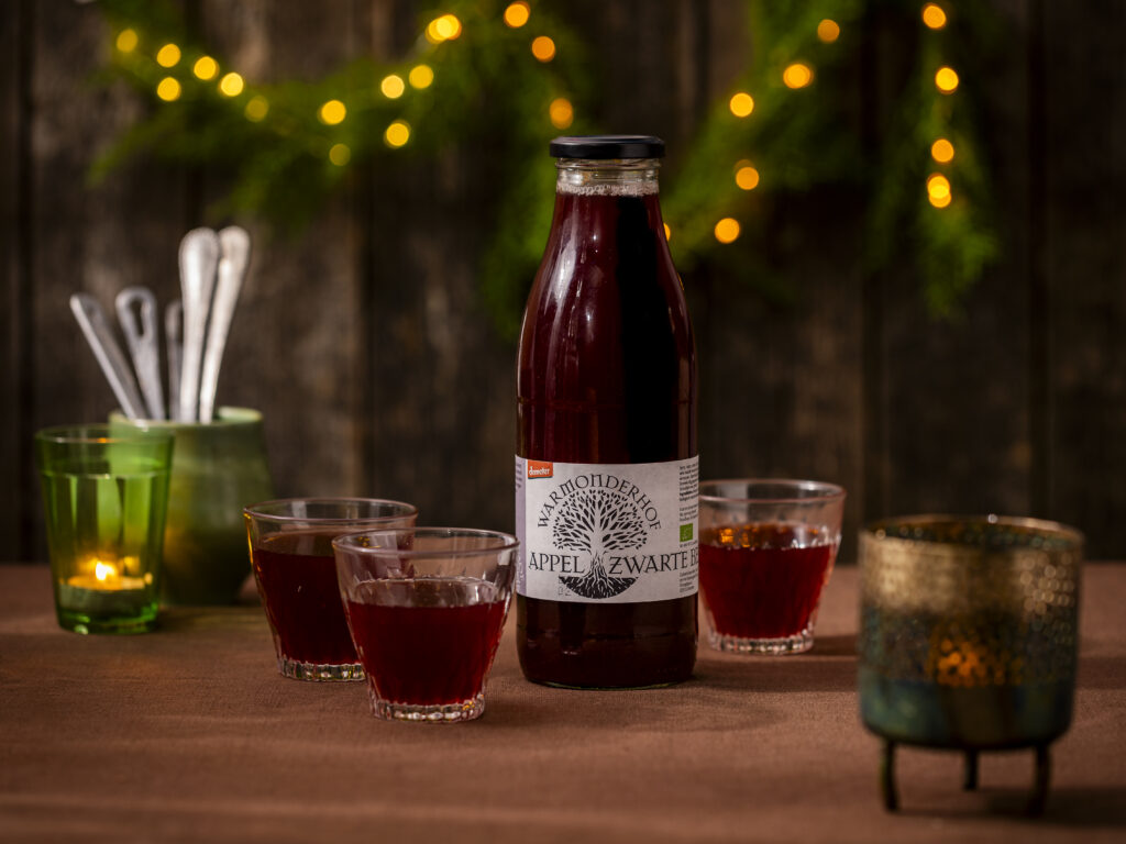 Prachtig diep rood sap uit de boomgaard waar Hofweb.nl in 2004 ontsproot. Het zacht zoete van de appel, combineert zeer aangenaam met het licht tintelende zuurtje van de zwarte bes.